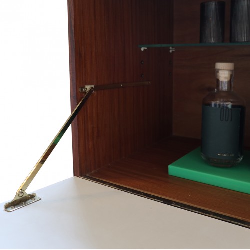 Several drawers, bar with glass shelf. One interior drawer.