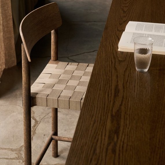 The chair is made from water-based lacquered or oil-treated solid and wood and form-pressed veneer. The linen seat is webbed by hand.