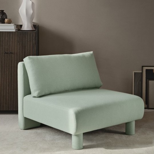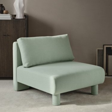 Backrest/seat: PU foam and polyester wadding with wooden internal structure. Backrest cushion: Fabric cover matching the backrest and seat. Foam and silicone fibre padding covered with wadding. Legs: Solid birch with upholstered finish. FSCTM Mix certified wood. New display model with one cushion.