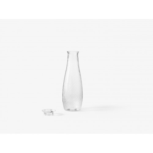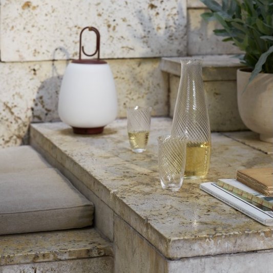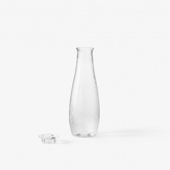 Simple and decidedly modern in appearance, this glass and carafe set boast a subtle whirlpool motif that mirrors the swirling nature of water. Nodding to a common feature in Asian design, the glasses include a small lip on their edge that creates a natural place for the lip to rest. They are part of Collect, a curated line of beautifully crafted soft furnishings and home objects designed by Space Copenhagen for & Tradition.
