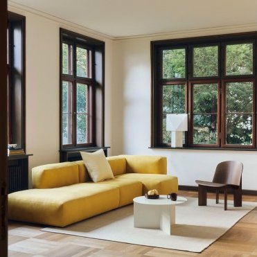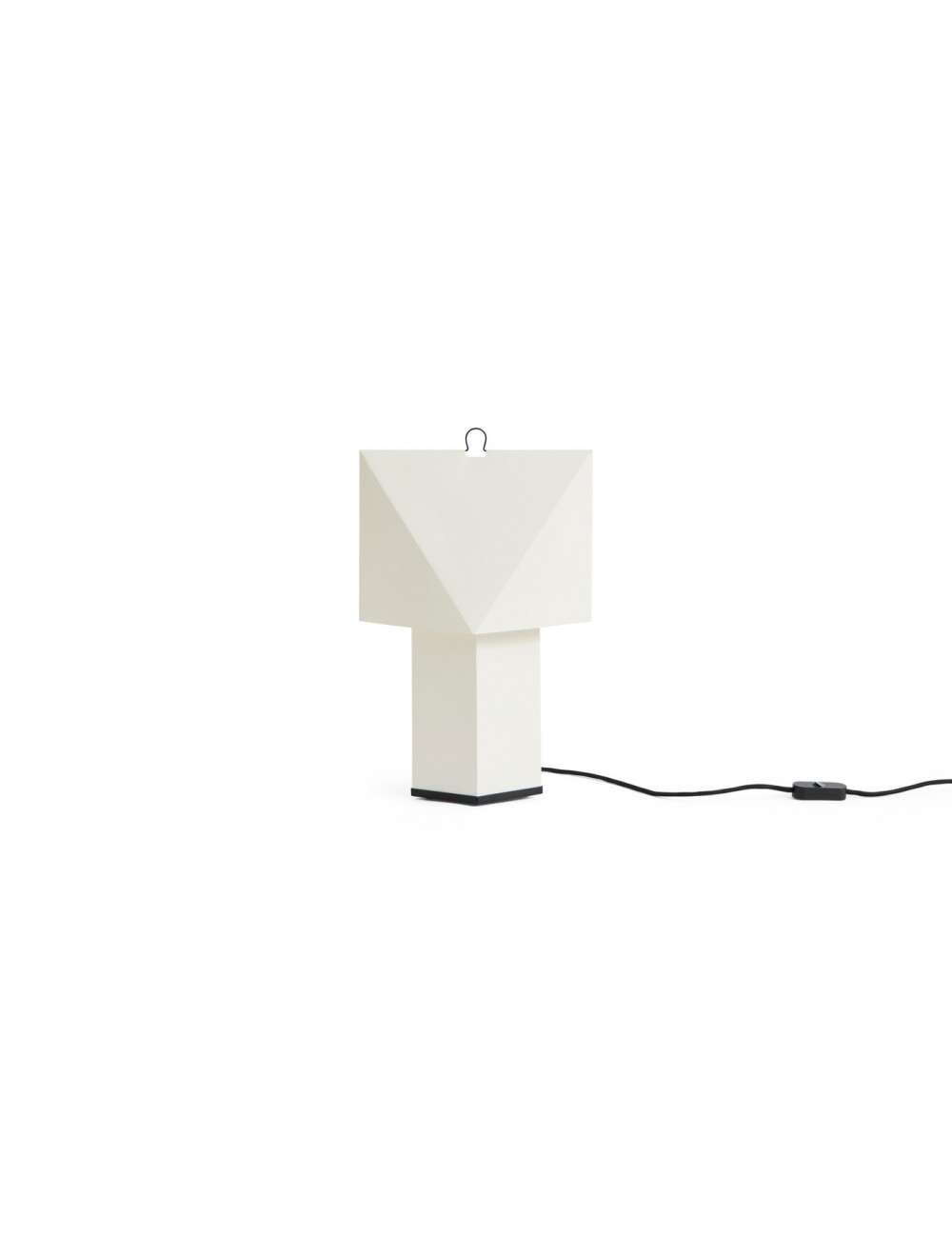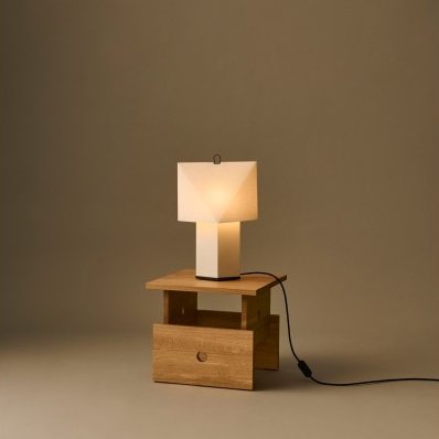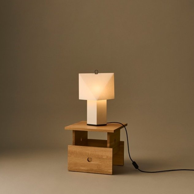 Designed by the French design duo CPRV, Aplat Table Lamp is a lightweight, sculptural lamp crafted primarily from folded paper. Its flat-packed design is assembled by the user, with precise lines and angles that build volume and shape it into a simple, graphic form. The diffused paper surface emits an ambient glow reminiscent of candlelight, adding warmth and atmosphere to its surroundings. Its minimal construction, paired with a discreet metal hook, make it lightweight and easy to move wherever light is needed.