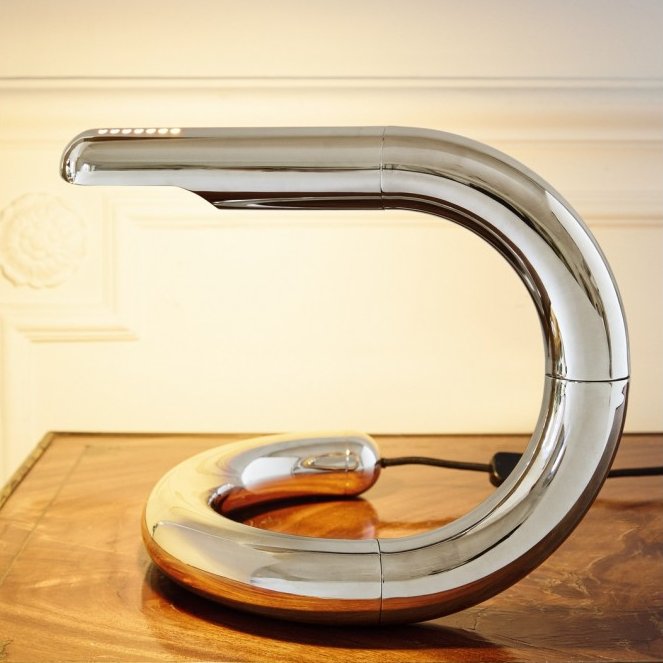 Sculptural and glossy like a gem, the Aspide lamp presents a sinuous silhouette reminiscent of a serpent. This jointed lamp is flexible and modular, and can be transformed and adjusted to however you like, or need, your lighting. Its silhouette changes as you interact with it. The Aspide lamp was designed in 1970 by Italian designer Gianfranco Frattini (1926 - 2004). It doesn't look like any other lamp, whilst also magnificently representing its era. Aspide is both an industrial design piece with functionality at its essence and an irresistibly playful and modern design expression. The body of the lamp is composed of curved iron tubes with joints that allow for the collar and head to continuously turn around their axis by up to 350°, giving the user the option of easily controlling the light in their space. A counterweight housed in the base makes sure that the lamp is stabilised and doesn't tip over in any position. The sparkling chrome-finish covering gives Aspide a mirrored surface that reflects light. This lamp is both cheeky and precious, demonstrating that, in Frattini's hands, glamour and fantasy and coexist in a single piece. The Aspide table lamp was designed as a work or reading lamp, which can be turned towards the wall to create a softer, ambient light. Gianfranco Frattini has left an everlasting mark on the landscape of modern Italian design over his career, spanning 50 years, as he demonstrated a tireless passion for materials, meticulous attention to functional detail, and a profound admiration of artisan and construction methods. Revolutionary lighting designs were refined with incredible modernity.