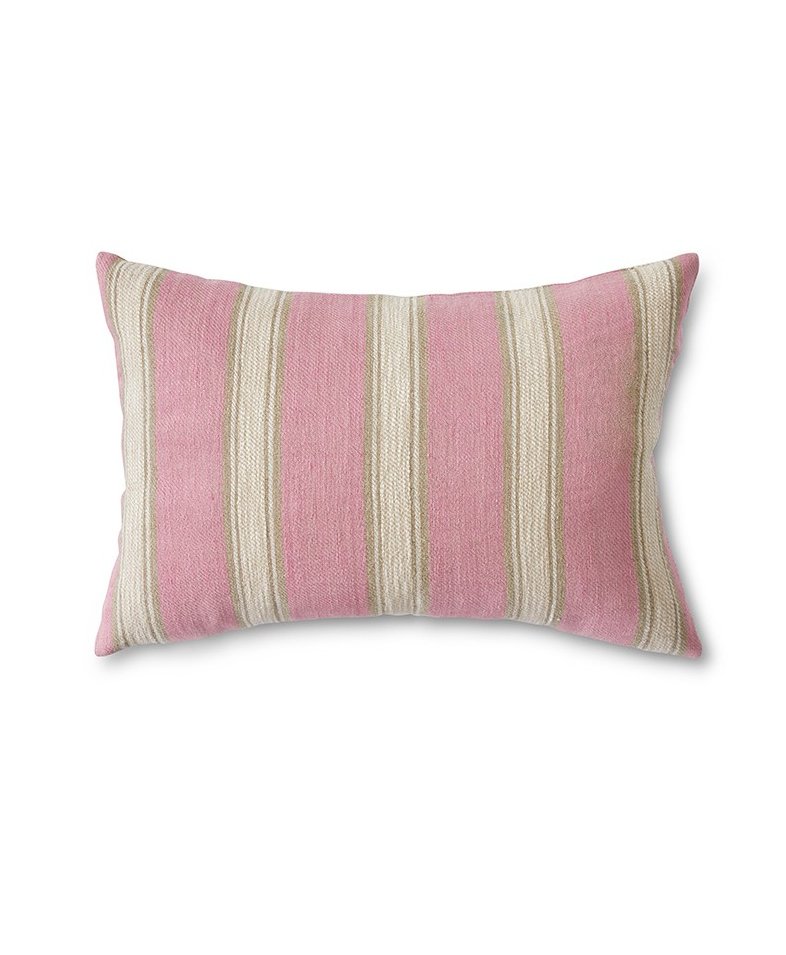 Ce coussin tissé présente une douce rayure verticale dans des tons rose blush et crème.