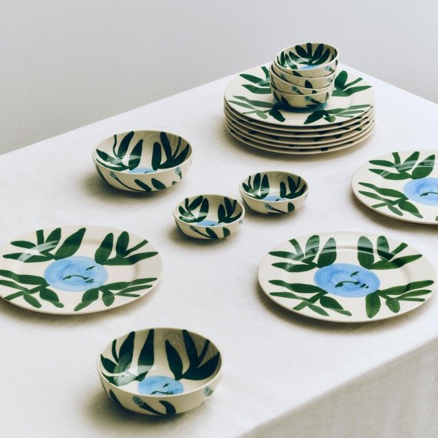 La collaboration avec l'artiste américaine Emma Kohlmann, reconnue internationalement, permet d'introduire son univers distinct dans la maison, sous la forme d'une collection de charmants articles de table en céramique.