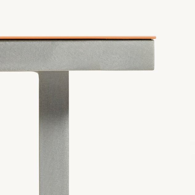 La table peut être considérée comme le prolongement créatif de la chaise alu. Comme la chaise, la table alu se compose d'un cadre en aluminium léger et d'une surface laquée épaisse, ce qui permet à la couche de couleur de devenir un matériau à part entière.