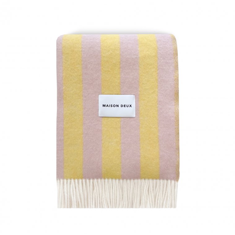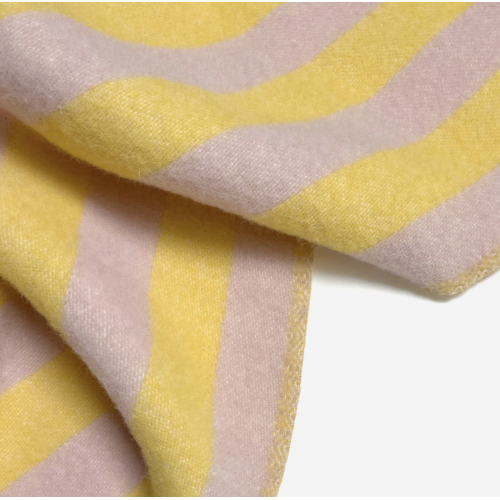 La Couverture Candy Wrap Rose Jaune est un tissu jacquard composé à 100% de laine de Nouvelle-Zélande, avec des franges sur les côtés courts.